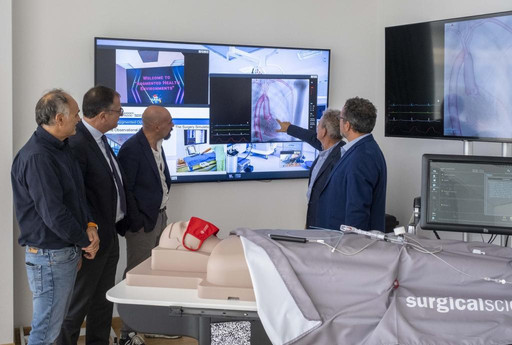 Upon entering the high-tech surgical rooms equipped with an array of devices, including big screens, sensors, simulators, and robotic arms, visitors are transported into a realm where innovation meets healthcare. The laboratory serves as an experimental space to leverage existing technological solutions, such as simulations of endovascular surgery on the aorta, with Surgical Science’s ANGIO Mentor simulator.
