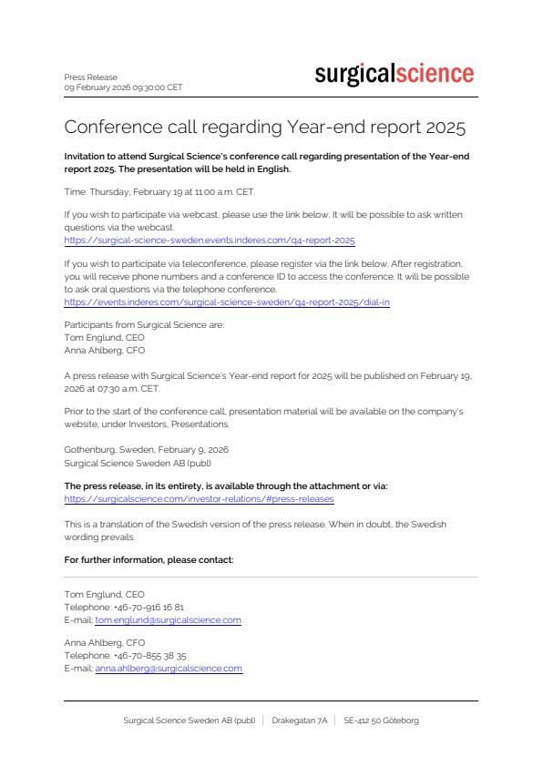 A press release with Surgical Science’s Year-end report for 2025 will be published on February 19, 2026 at 07:30 a.m. CET.