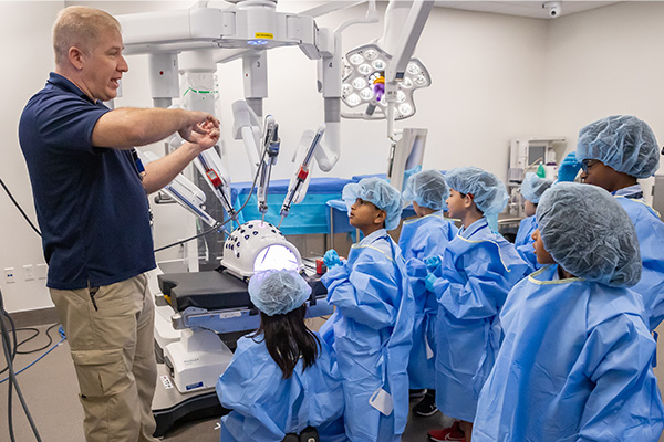 The tour included interactive stations showcasing state-of-the-art medical technology. At the da Vinci robotic Surgical System station, the children observed the cutting-edge technology in action, marveling at its precision and capabilities.
