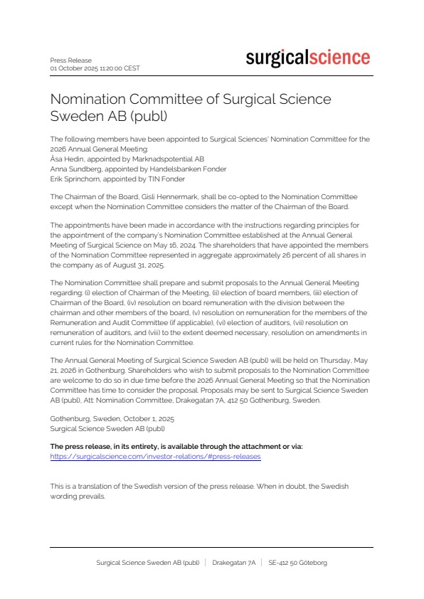 The Annual General Meeting of Surgical Science Sweden AB (publ) will be held on Thursday, May 21, 2026 in Gothenburg. Shareholders who wish to submit proposals to the Nomination Committee are welcome to do so in due time before the 2026 Annual General Meeting so that the Nomination Committee has time to consider the proposal. Proposals may be sent to Surgical Science Sweden AB (publ), Att: Nomination Committee, Drakegatan 7A, 412 50 Gothenburg, Sweden.