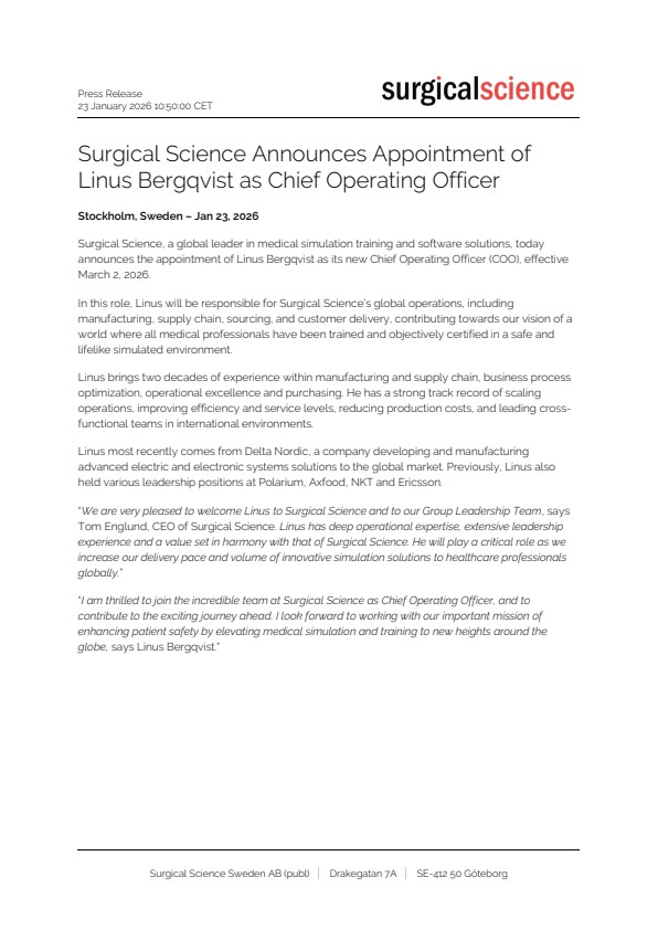 “I am thrilled to join the incredible team at Surgical Science as Chief Operating Officer, and to contribute to the exciting journey ahead. I look forward to working with our important mission of enhancing patient safety by elevating medical simulation and training to new heights around the globe, says Linus Bergqvist.”