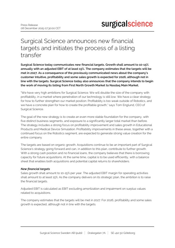 Surgical Science today communicates new financial targets. Growth shall amount to 10-15% annually with an adjusted EBIT of at least 15%. The company estimates that the targets will be met in 2027. As a consequence of the previously communicated news about the company's customer Intuitive, profitability and some sales growth is expected for 2026, although not in line with the targets. Surgical Science today also announces that the company intends to begin the work of moving its listing from First North Growth Market to Nasdaq Main Market.