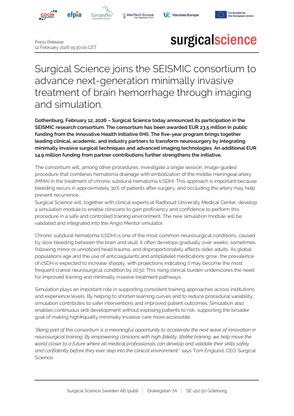 Gothenburg, February 12, 2026 – Surgical Science today announced its participation in the SEISMIC research consortium. The consortium has been awarded EUR 23.5 million in public funding from the Innovative Health Initiative (IHI). The five-year program brings together leading clinical, academic, and industry partners to transform neurosurgery by integrating minimally invasive surgical techniques and advanced imaging technologies. An additional EUR 14.9 million funding from partner contributions further strengthens the initiative.