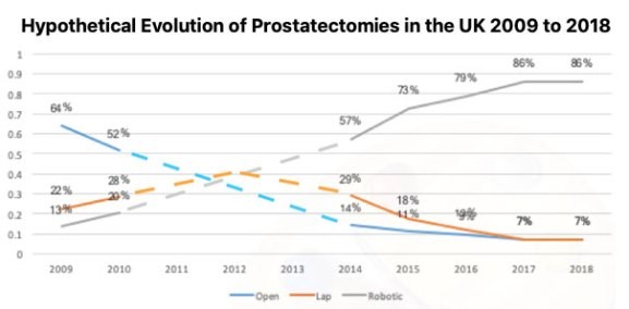 I have been doing some analysis on the adoption RARP (Robotic Assisted Radical Prostatectomy) in the UK and have developed a mixed chart using two data sources. The first being data from a report published by The British Association of Urological Surgeons Limited (BAUS) in 2012 on the development of RARP in the UK2. This provided data for 2009 and 2010. The data from 2014 onwards is based on my own research from the BAUS registry. The dotted lines are a hypothesis on what might have happened between the two published data sets.