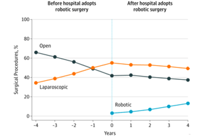 From 2012 to 2018, 23 of 73 hospitals (31.5%) in the Michigan Surgical Quality Collaborative started performing robotic general surgery. These data are restricted to those hospitals.